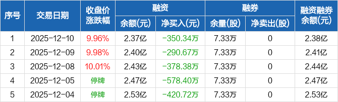 融资方面,当日融资买入0元,融资偿还350.34万元,融资净偿还350.34万元,连续10日净偿还累计8390.54万元。融券方面,融券卖出0股,融券偿还0股,融券余量7.33万股,融券余额90.6万元。融资融券余额合计2.38亿元。