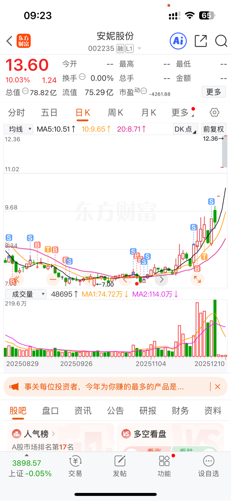 $安妮股份(SZ002235)$ 差一点儿就让我发了财