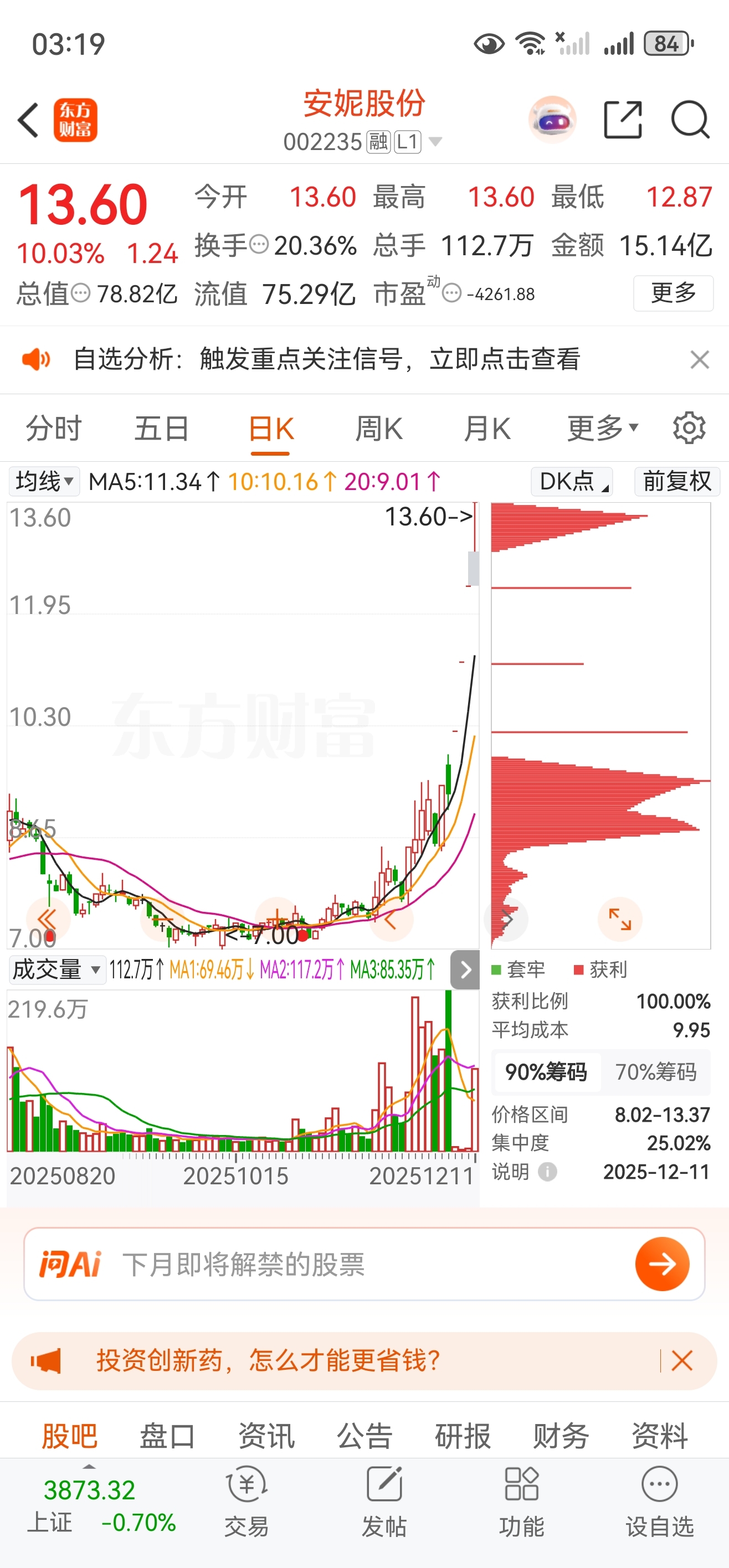 $安妮股份(SZ002235)$ 底部筹码纹丝不动