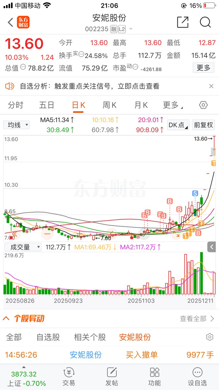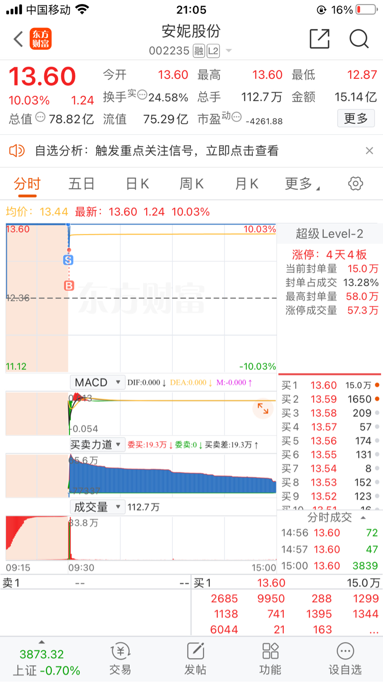 $安妮股份(SZ002235)$ 各位安妮的朋友们,好些天没来发帖了,自上次封板后期望安妮走出一波人民同泰的走势,居然被我言中了,被晟世天收购确实是意外之喜,翻倍也就在明日了,近几日安妮抢筹情绪非常浓厚,所以预测今天开盘会有非常强的买盘,但由于三个一字,必然会有一定抛压,所以开盘之前有提前想好今天日内做踢,安妮换手率看,健康换手,总体还是比较惜售,封板后并没有被大盘情绪和其他高标所影响,唯一不利的是今天买盘一家独大,可以说明天能否连板很大程度取决于这位手握4个小目标的游资,他的砸盘力度过大会带动大批获利盘出逃,因为明日周五时间节点,除非明日大盘强修复,否则有资金兑现预期,当然也有东百竞价走弱被核加剧资金抱团安妮可能,明天个人操作不建议做踢,会影响承接情绪,看好建议锁仓观望,看场外资金进场力度抉择,龙头是走出来的,不是猜出来的,也不是看出来的,平潭能走到现在你看的出来吗?另外我认为明天福建板块和海南板块有一定修复预期,合理讨论,不喜勿喷,我不吹票,客观分析