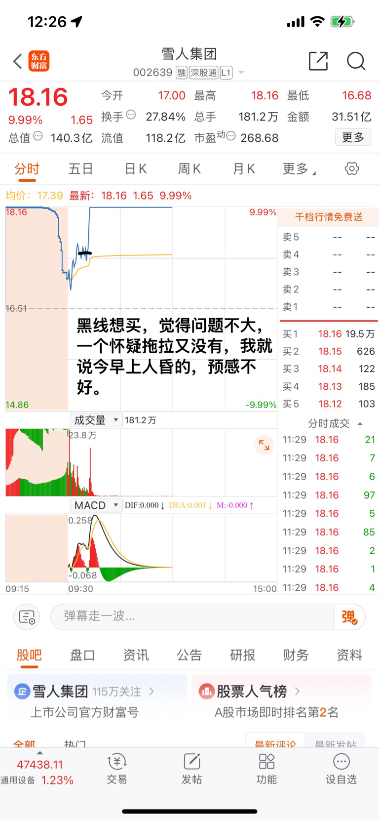 $安妮股份(SZ002235)$ $顺灏股份(SZ002565)$$雪人集团(SZ002639)$ 安妮,下午上去吧,想证明自己没有错。虽然走弱了,但下午终归会回到你的价。预期红了稳着就行。