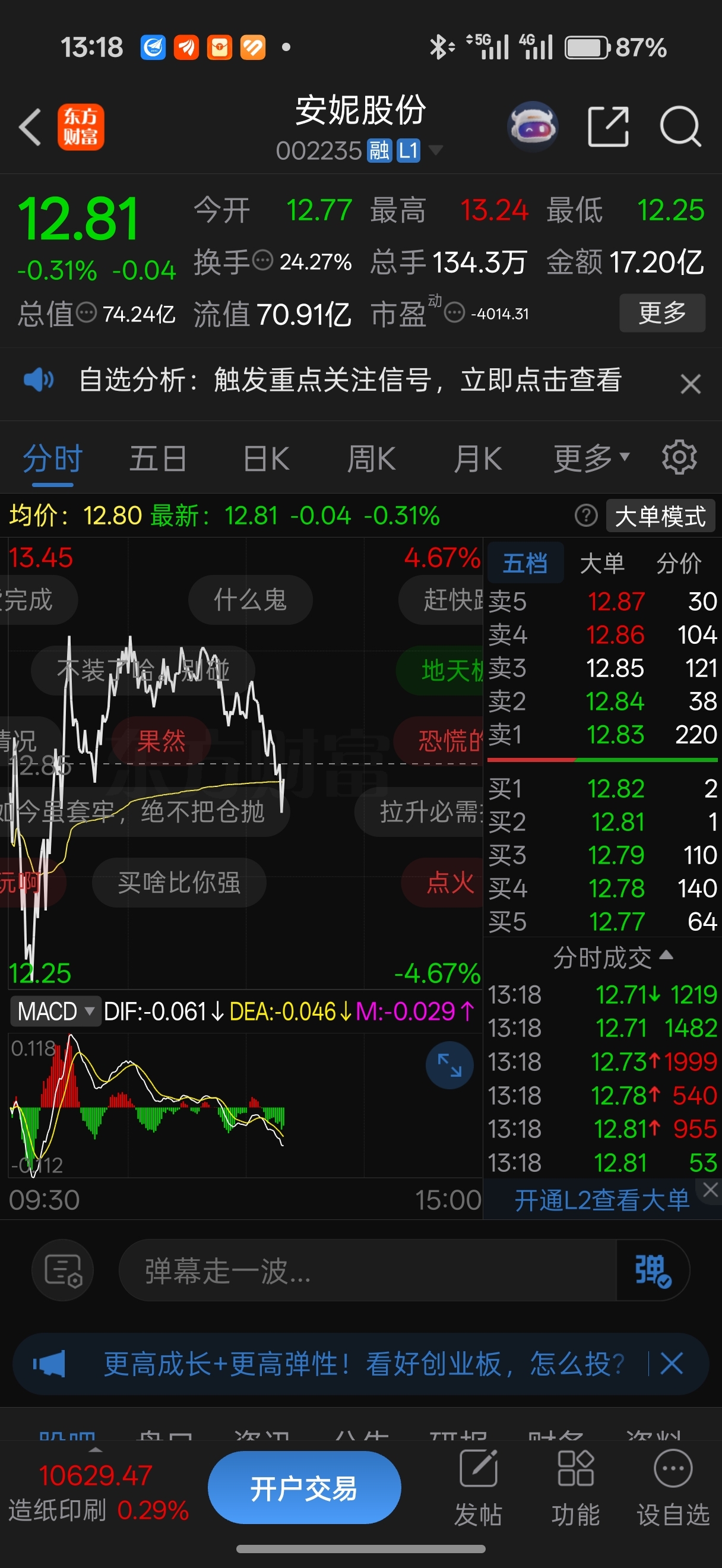 $安妮股份(SZ002235)$ 12.71元全仓买入,坐等封板