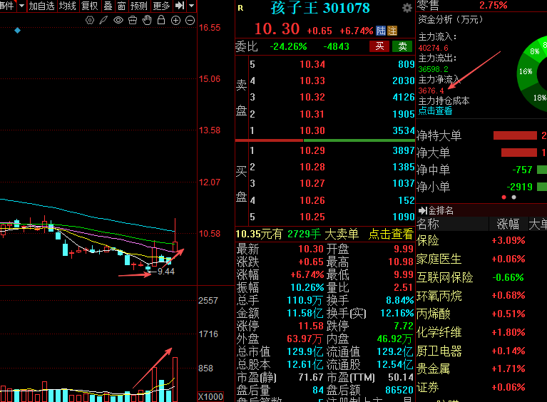 孩子王;在阶段低点后,也是连续呈现出突破态势!尤其是伴随着消费板块的复苏回暖,昨天再度发力向上突破!虽冲高后有所回落,但全程维持红盘震荡,做多动能明显增强,主力也持续流入。技术面来看,形成水下金叉,做多动能越发强劲,这锤子线还是有试盘嫌疑的。当前叠加行业回暖与估值修复双重逻辑,还是比较看好它向上加速修复的趋势。今日可多看看盘中承接情况与修复力度再做打算