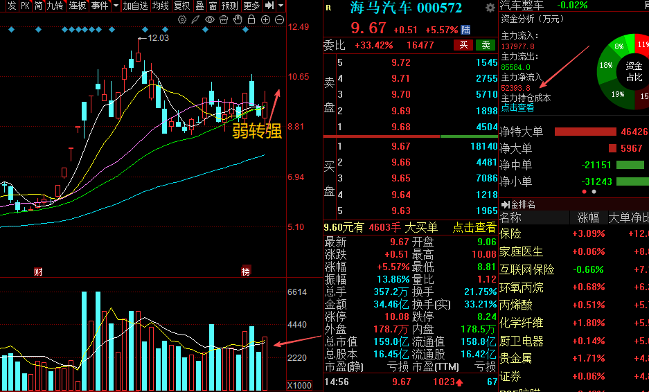 海马汽车;上周三涨停后,连续两个交易日调整,昨天再度弱转强向上了,转强迹象相当明显,量价配合得也很不错!核心还是海南自贸港封关在即,这可是历史性时刻,利好支撑很扎实,整体还是比较看好它接下来的表现,有望走出一波不错的修复性行情,甚至来个小加速。今天早盘要是开的不高,或者给水下(1-2个点)承接不错,还是可以跟进看看的
