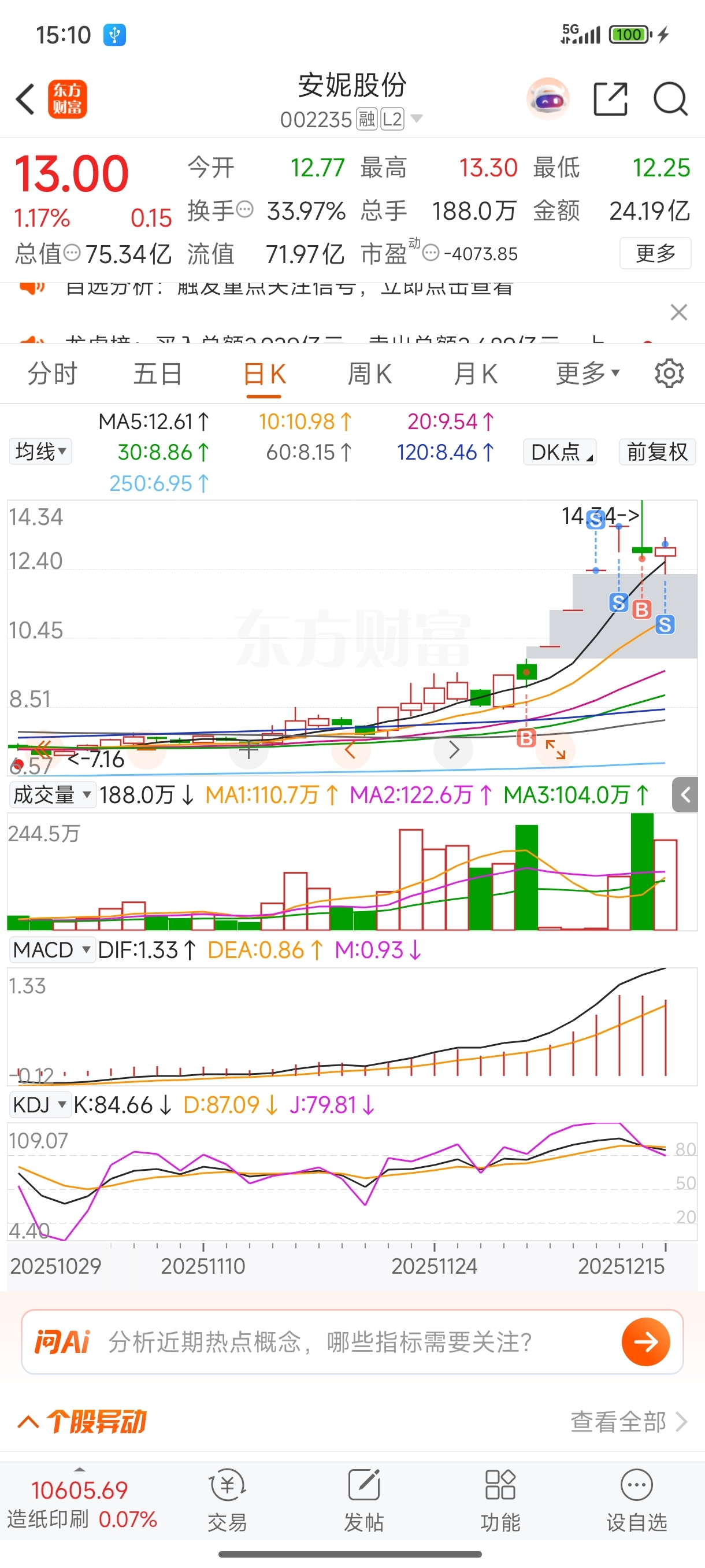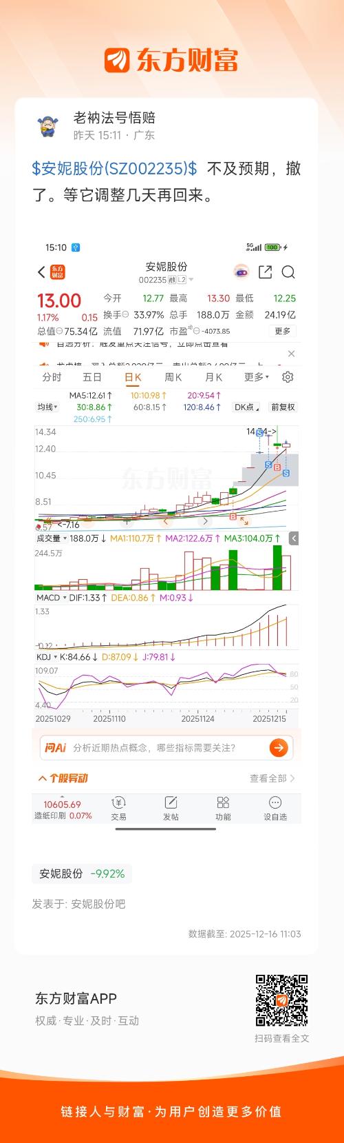 $安妮股份(SZ002235)$  不及预期,撤了。等它调整几天再回来。