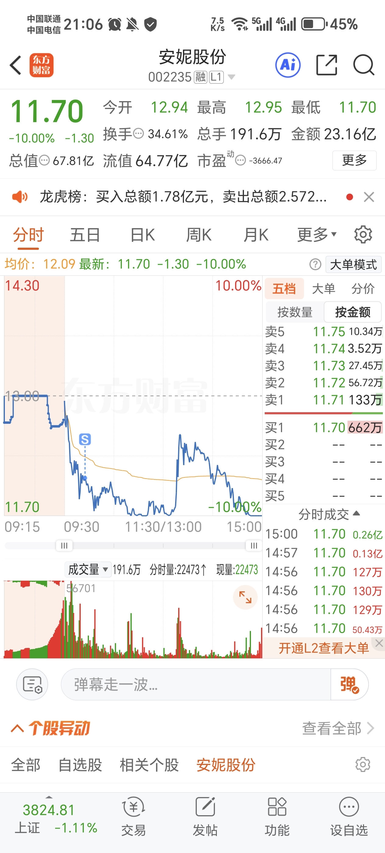 $安妮股份(SZ002235)$ ,打开手机一看就是一碗大面滴汗滴汗没忍住割了 明天不会大涨吧,感觉不能让兄弟们吃肉,明天买回来