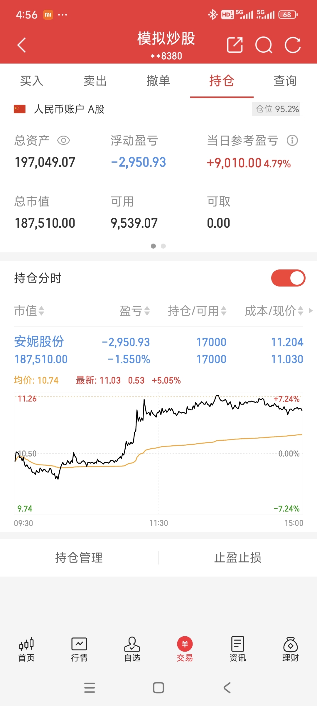 $安妮股份(SZ002235)$ 模拟盘快回本了,还是满仓,实盘还在做T还亏8个点,我真的要笑死