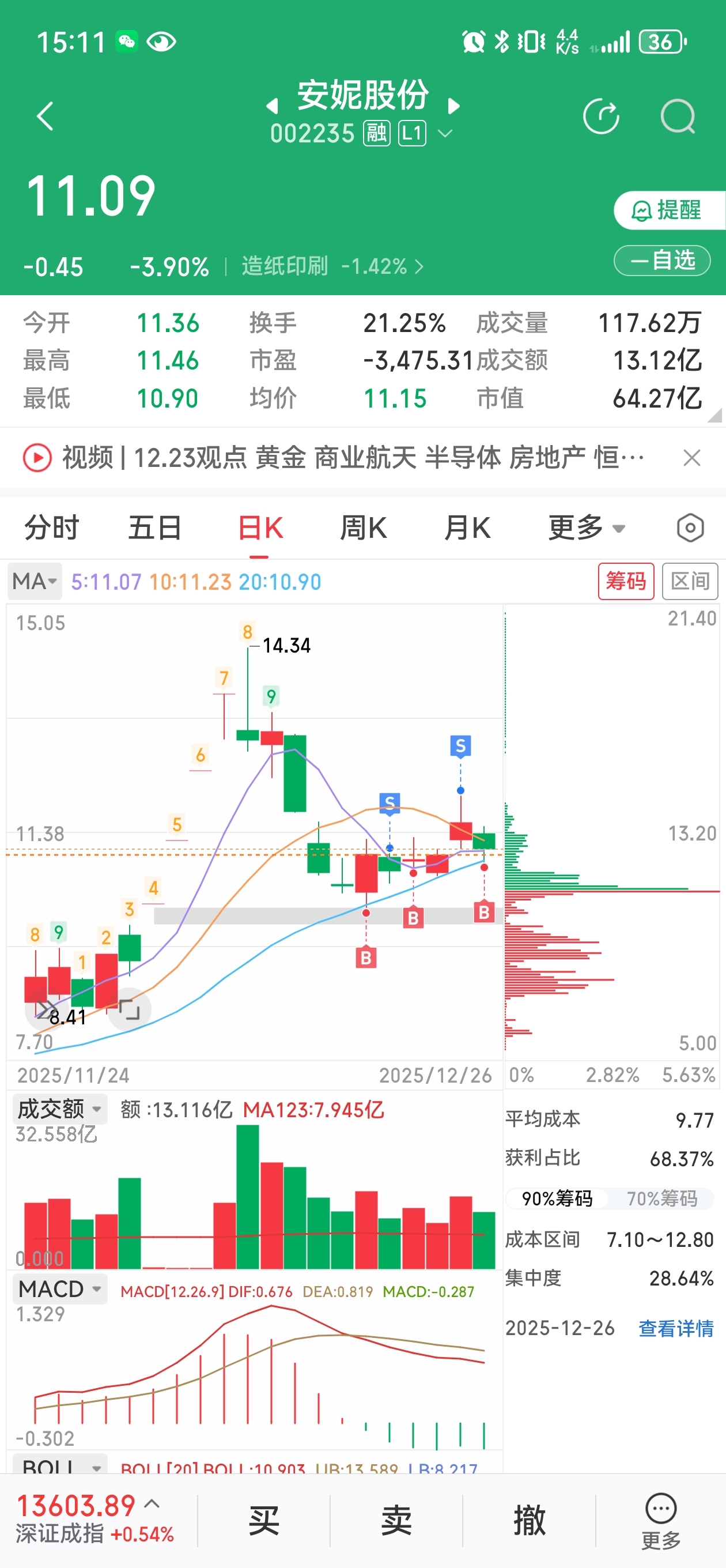 $安妮股份(SZ002235)$  沿20天低吸,冲高到16号的大阴线附近就撤,搞他个七进七出?