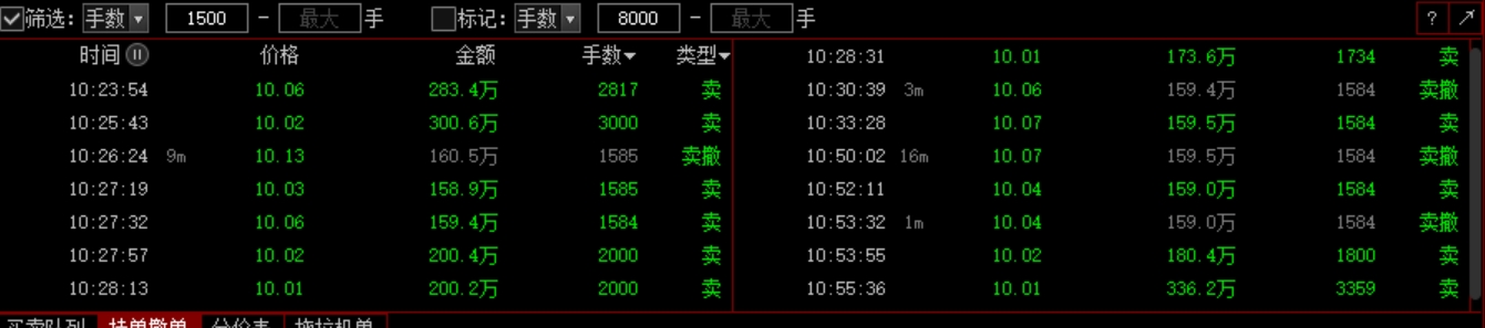 我在等。等连续3个超1500手的买单实际成交,我在补单