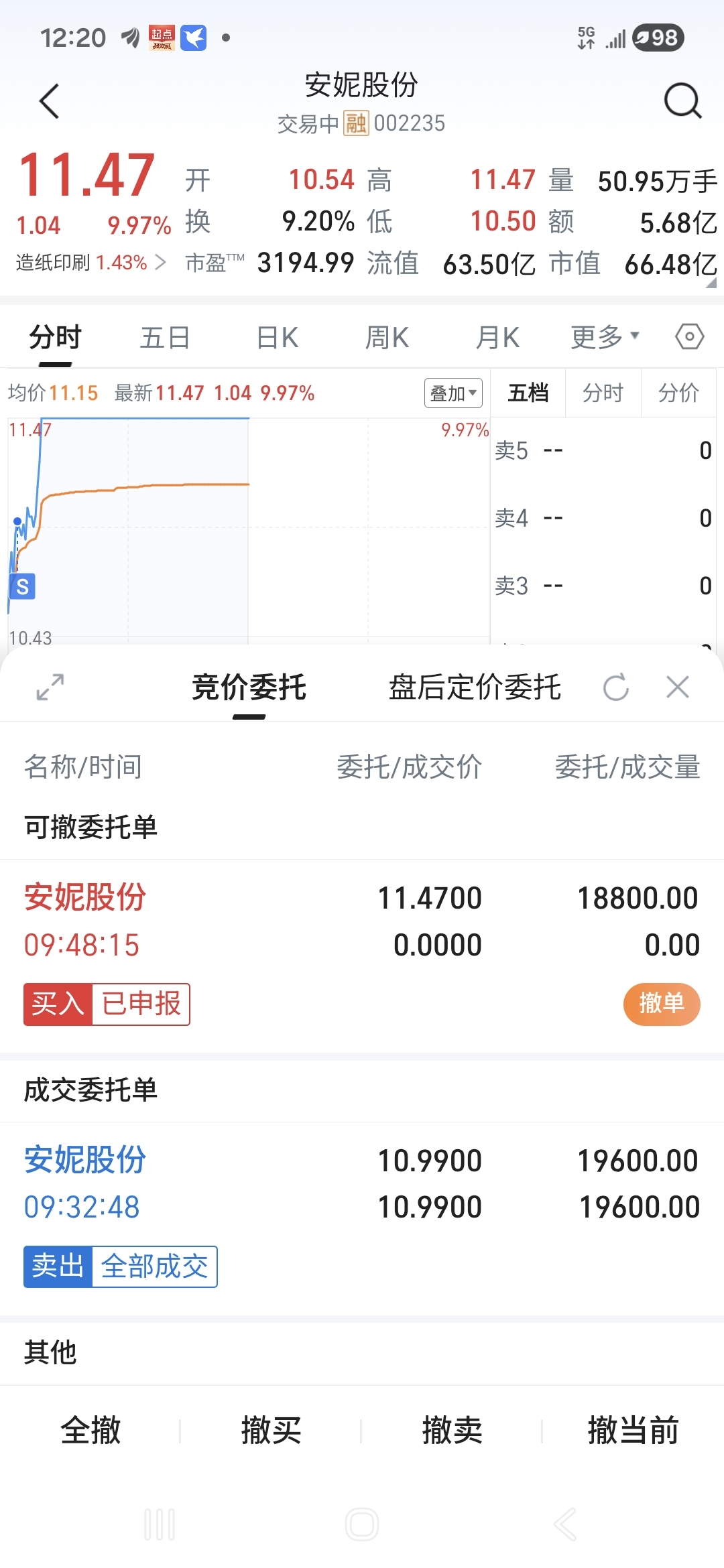 $安妮股份(SZ002235)$ 各位专家,帮我看看这个今天还能买的进吗?买不进我就撤单买别的了