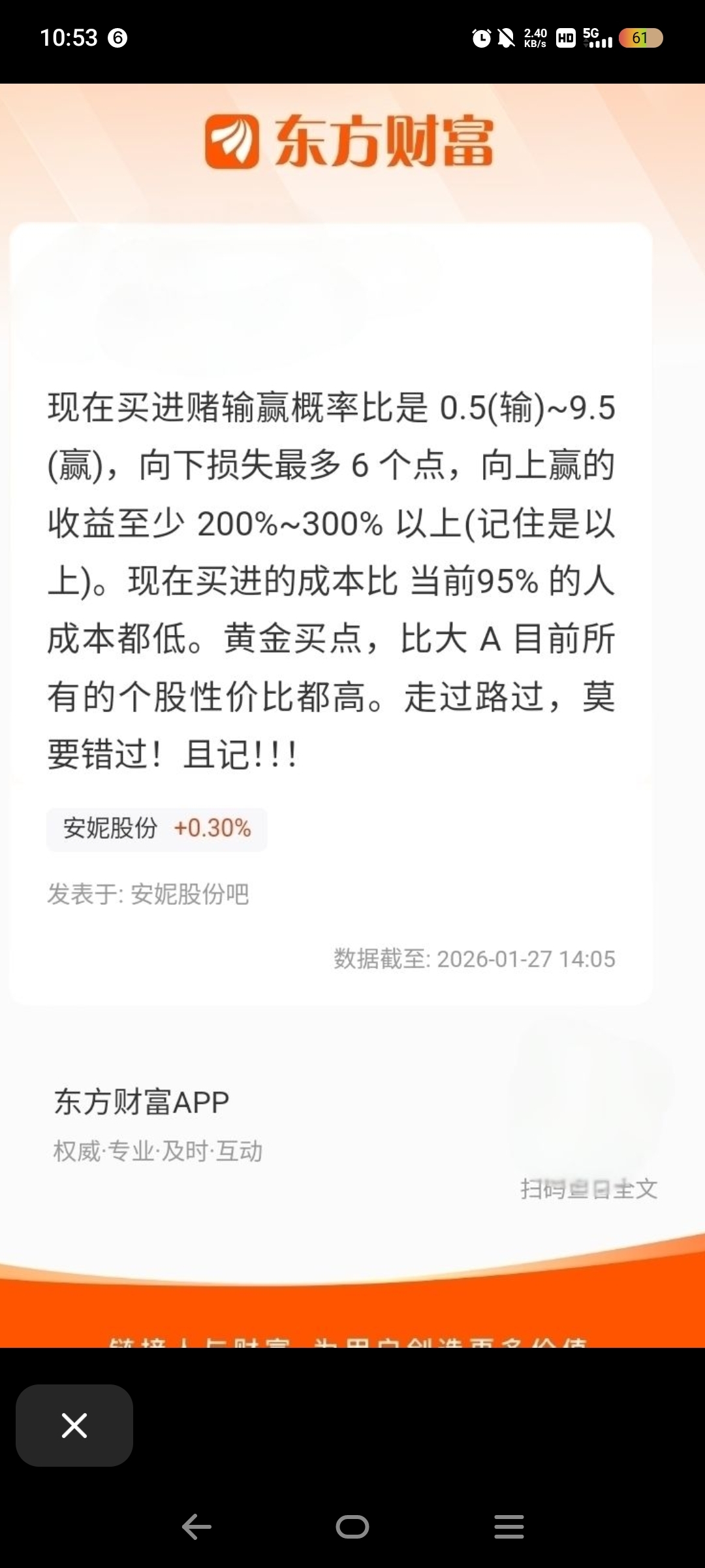 温馨提示: 1.根据《证券法》规定,禁止编造、传播虚假信息或者误导性信息,扰乱证券市场;2.用户在本社区发表的所有资料、言论等仅代表个人观点,与本网站立场无关,不对您构成任何投资建议。用户应基于自己的独立判断,自行决定证券投资并承担相应风险。《东方财富社区管理规定》