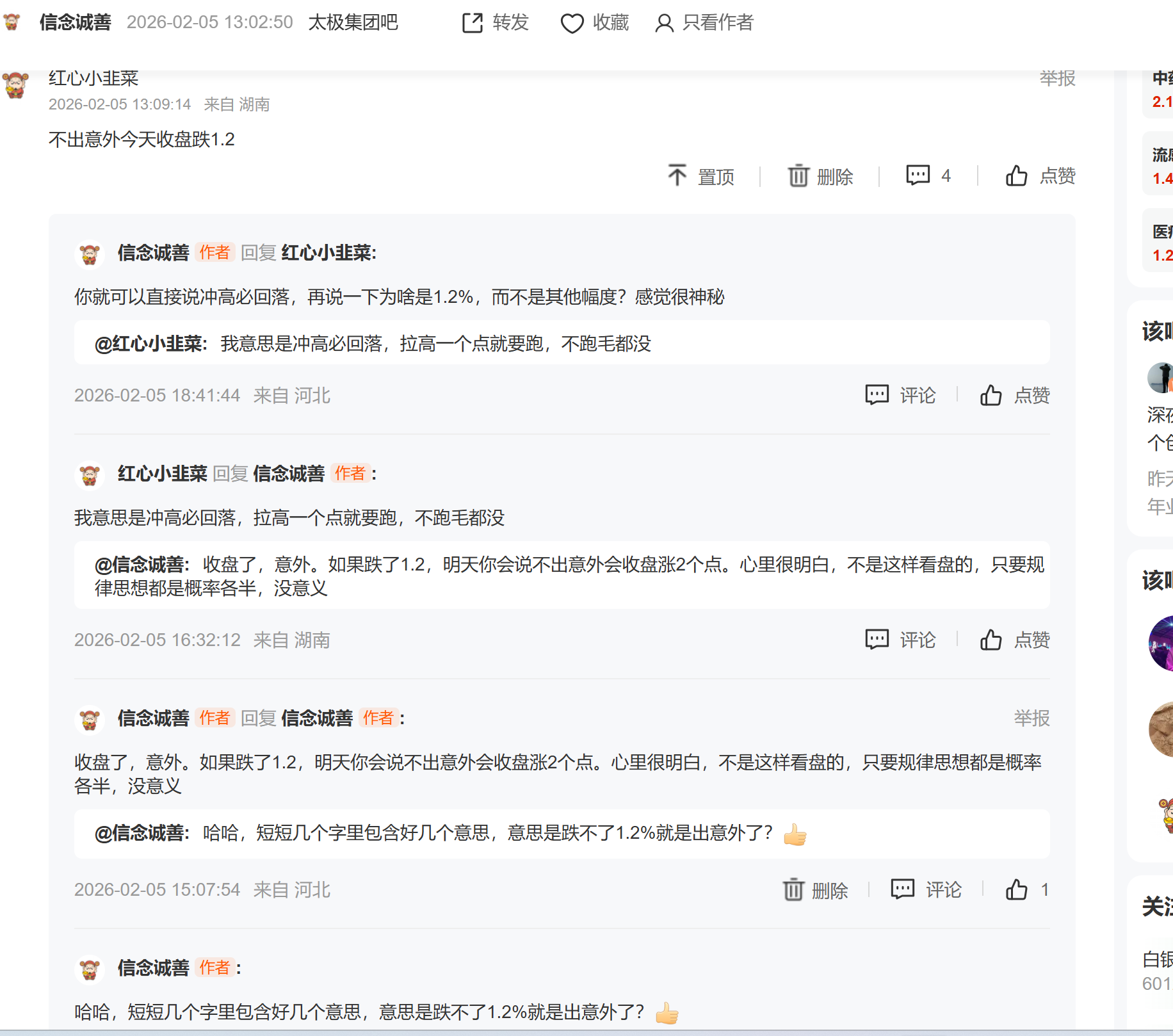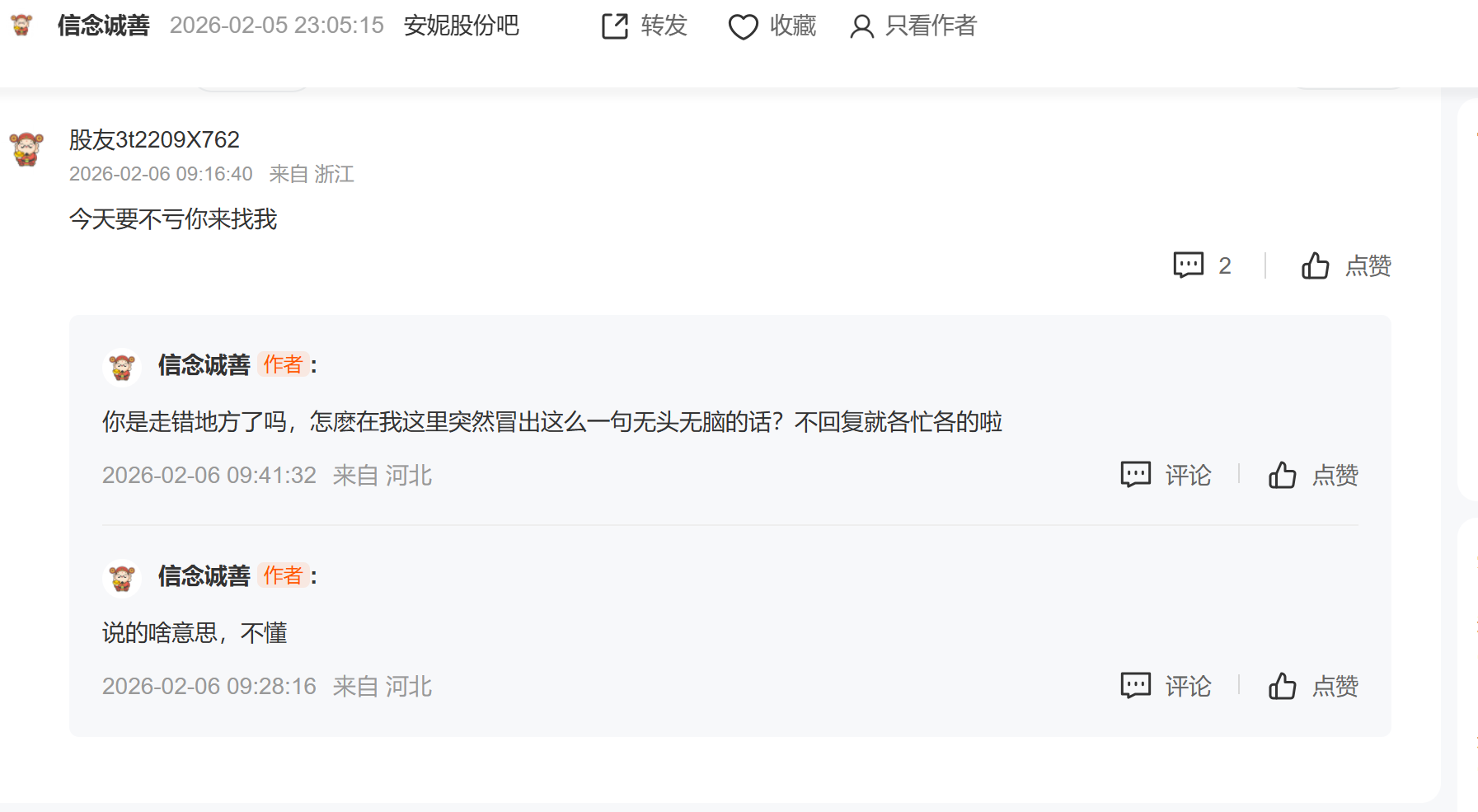 哦哦,我明白了,他是说的安妮今天肯定下跌,跌了就会说,怎么样我比你高。不跌就不说话,专门马后炮怼人的。我欢迎网友交流,三人行必有我师,不犯规的情况下有利于据说几句,这种两来话甚至三来话,即便你对了就说明你高吗。我不得不截个图说一下另一个人过后再很尴尬又不相关的解释。谁有本事自己去发帖,不要来这里说这些没用的了,正如下边好朋友说的,你在影响别人。起码的礼貌该有吧