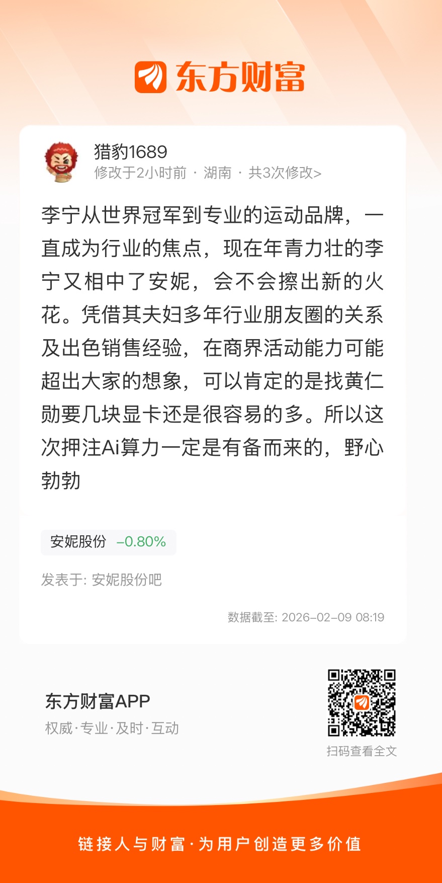 李宁从世界冠军到专业的运动品牌,一直成为行业的焦点,现在年青力壮的李宁又相中了安妮,会不会擦出新的火花。凭借其夫妇多年行业朋友圈的关系及出色销售经验,在商界活动能力可能超出大家的想象,可以肯定的是找黄仁勋要几块显卡还是很容易的多。所以这次押注Aⅰ算力一定是有备而来的,野心勃勃
