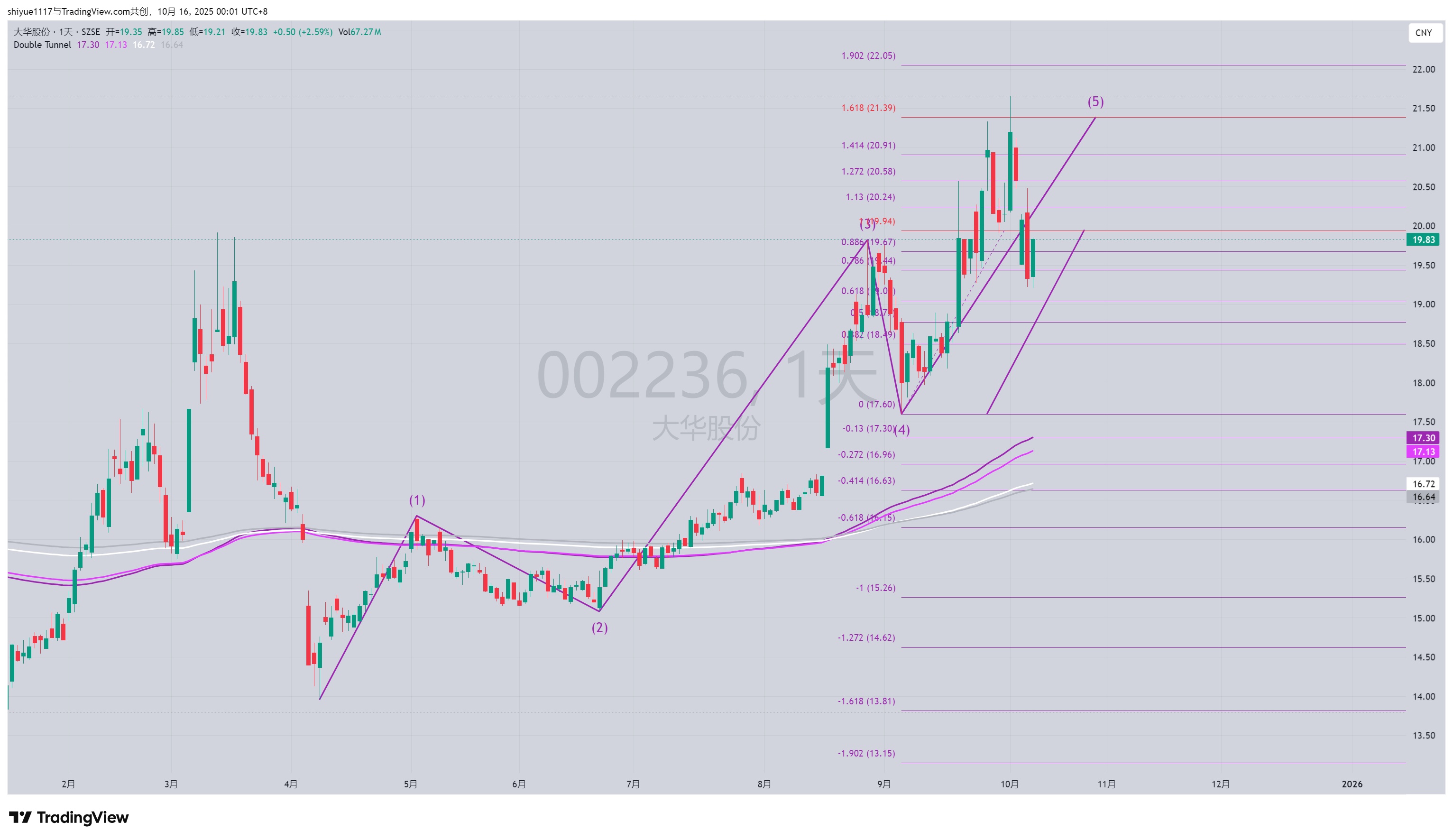 $大华股份(SZ002236)$ 五浪结构中,保守浪5=浪1(19.94),理想浪5=浪1*1.618(21.39)。波浪理论仅供参考。