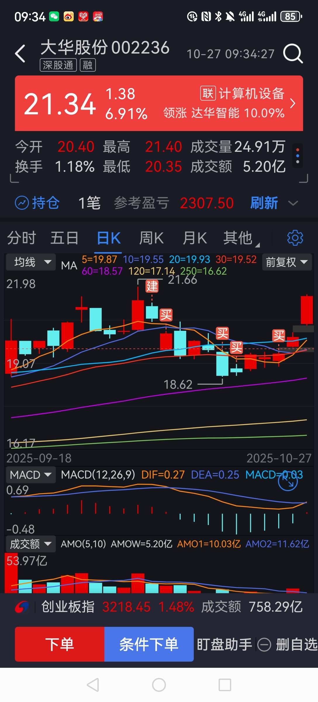 $大华股份(SZ002236)$ 舒服,找到一个和我孙子名字一样的股,一看业绩和市场前景,立马喜欢就进来了,本来越跌越买,结果上来了,可惜仓位有点低