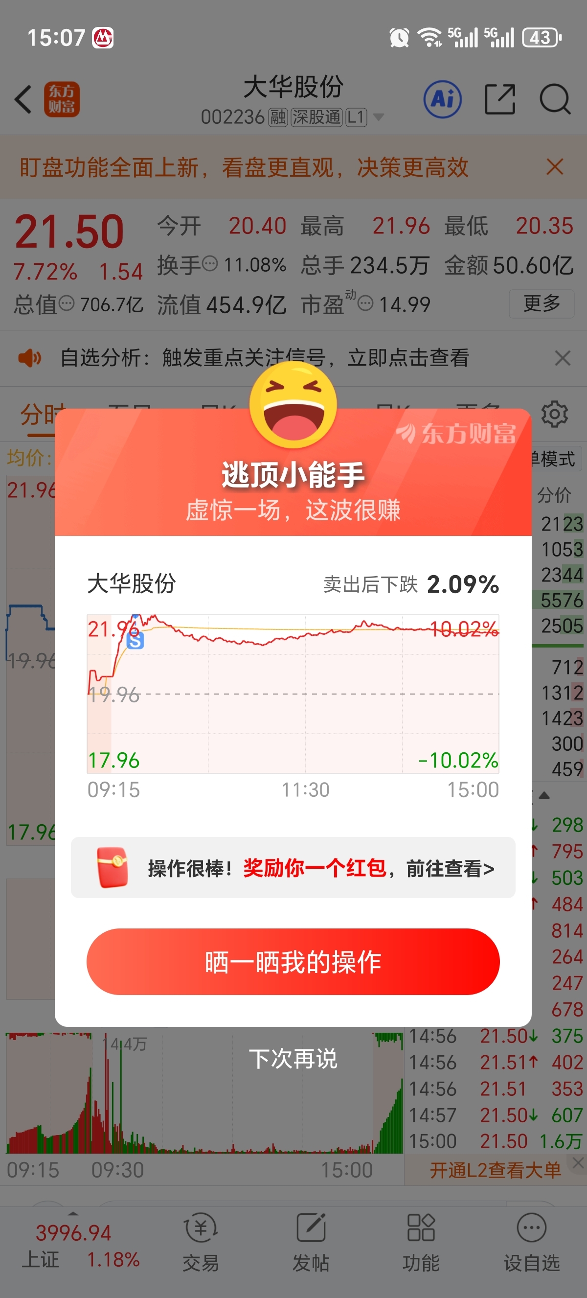 $大华股份(SZ002236)$ 走了 大涨之后还会调整啊 长线看好25 我还会回来的