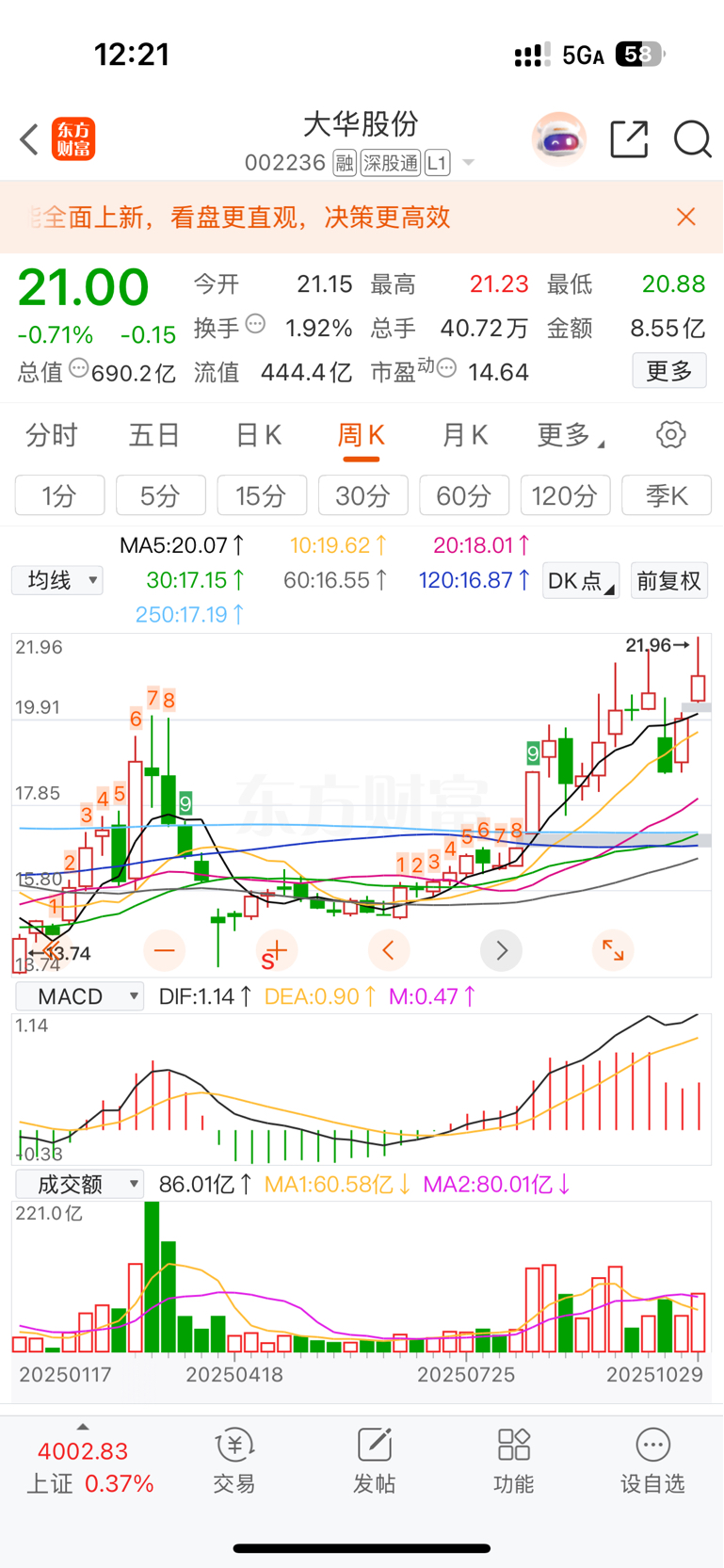$大华股份(SZ002236)$ 这个周线走势真是不太好看,希望周四五能往上走点,千万不要做周线级别M头,一定得保持高度警惕!