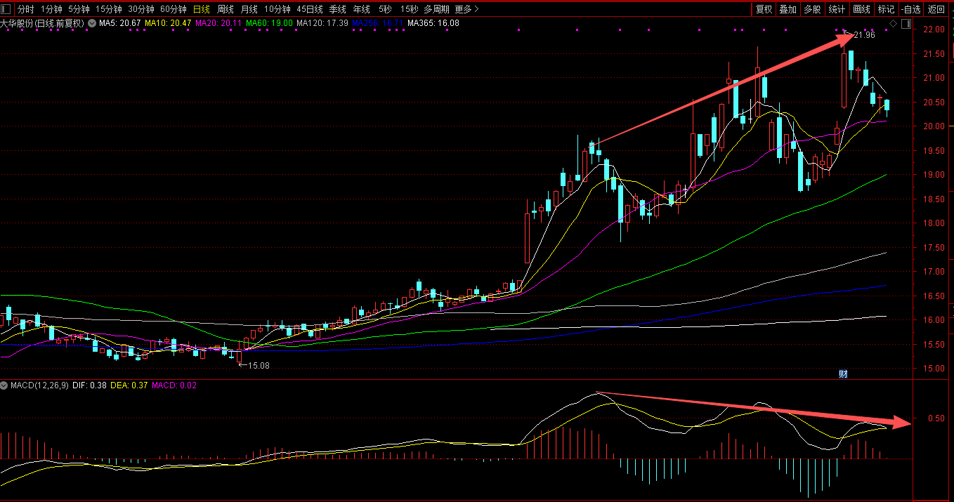 大华前期典型的借业绩出货,指标顶背离,股价新高但MACD顶部下移,背离严重说明大