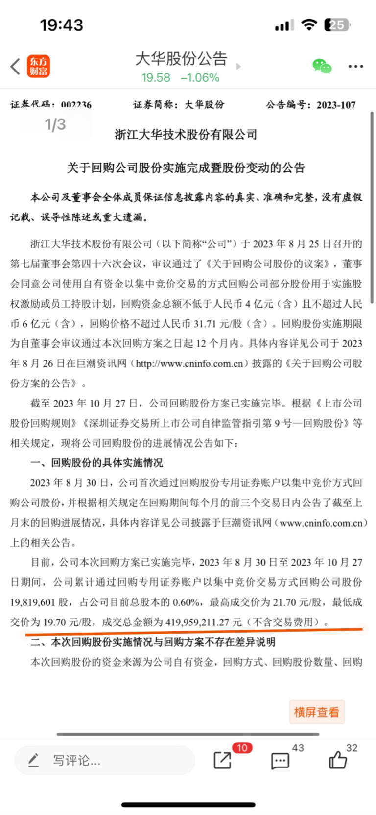 $大华股份(SZ002236)$ 23年回购的最高价21.7元发出来,把2年前回购的4个多亿也算进去了。这公司搞什么鬼,大跌拿这来忽悠。