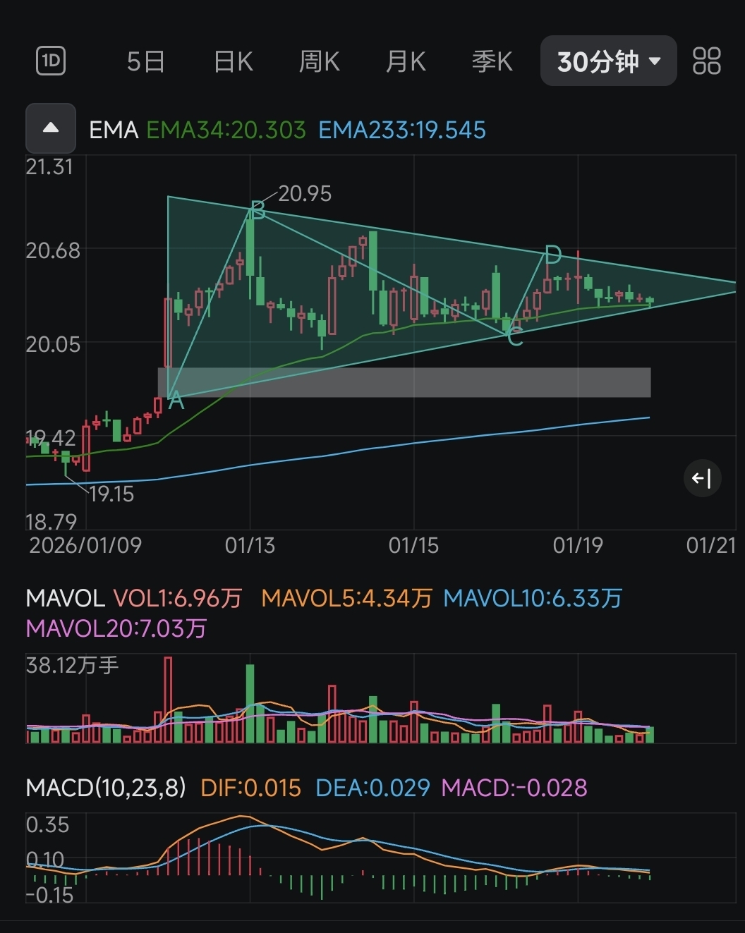 股价处于三角形整理下沿!毕竟盘中冲高20.67,所以仍然认为走势尚可!