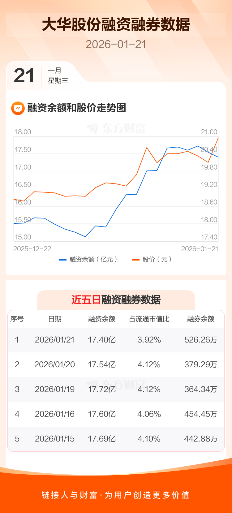 交易所最新数据显示,大华股份于2026年1月21日获融资买入2.95亿元,融资偿还3.09亿元,当日融资净偿还1411.5万元。目前,该股融资余额17.40亿,占流通市值比例为3.92%。