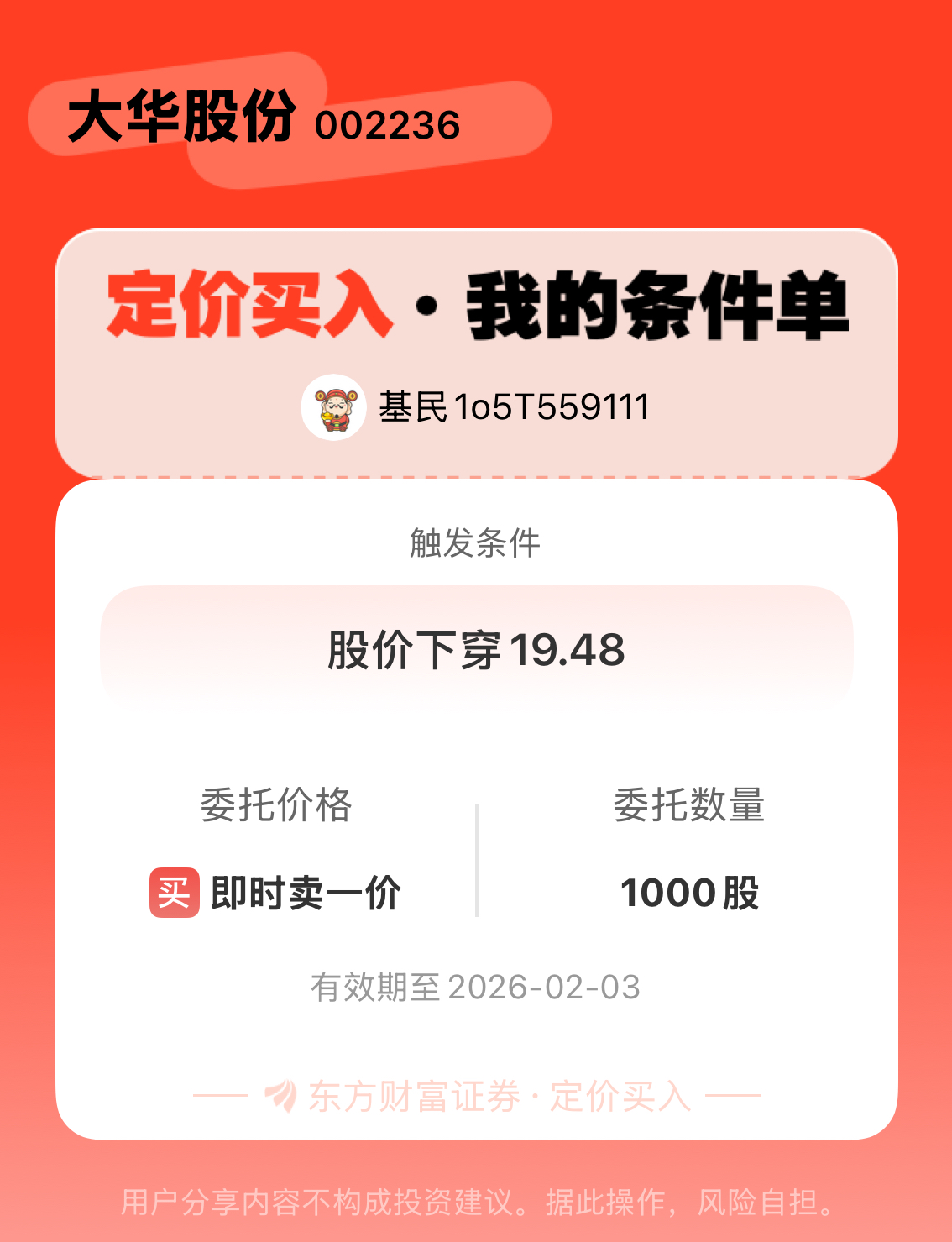 #条件单交流# #定价买入晒单# 一位股神设置了一个定价买入条件单,接下来就是见证奇迹的时刻~$大华股份(SZ002236)$