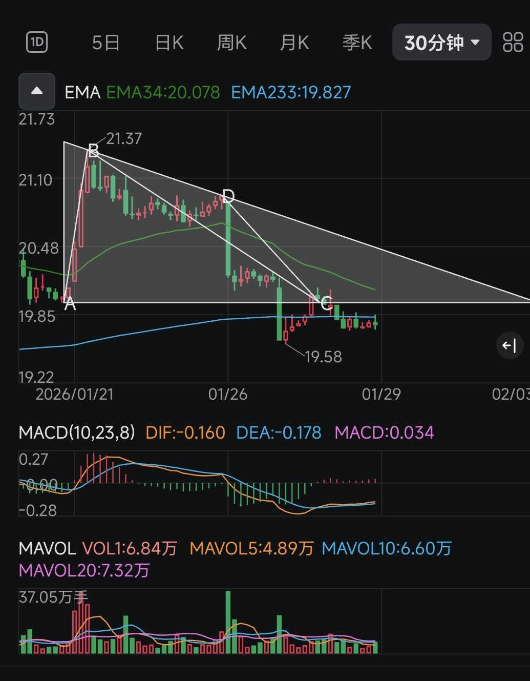 收盘价收在EMA34:19.76之下一分!希望本周最后能够重新回到三角形整理结构之内。