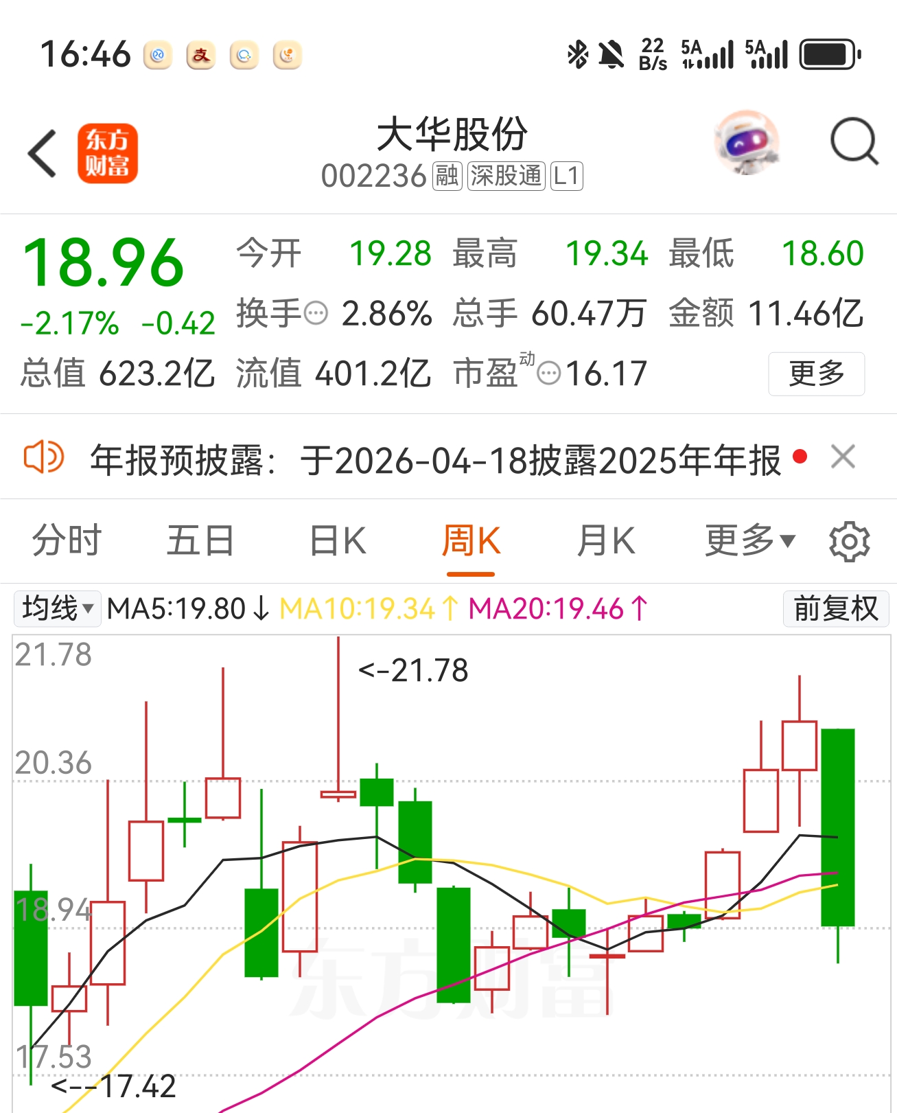 $大华股份(SZ002236)$ 涨了三周,一周就跌没了,真是人才!