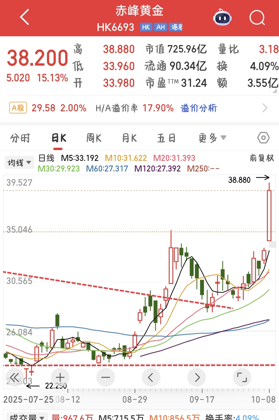 纯图形看港股的赤峰黄金和恒邦股份最近的走势很像的!赤峰黄金9月8号突破下降趋势9