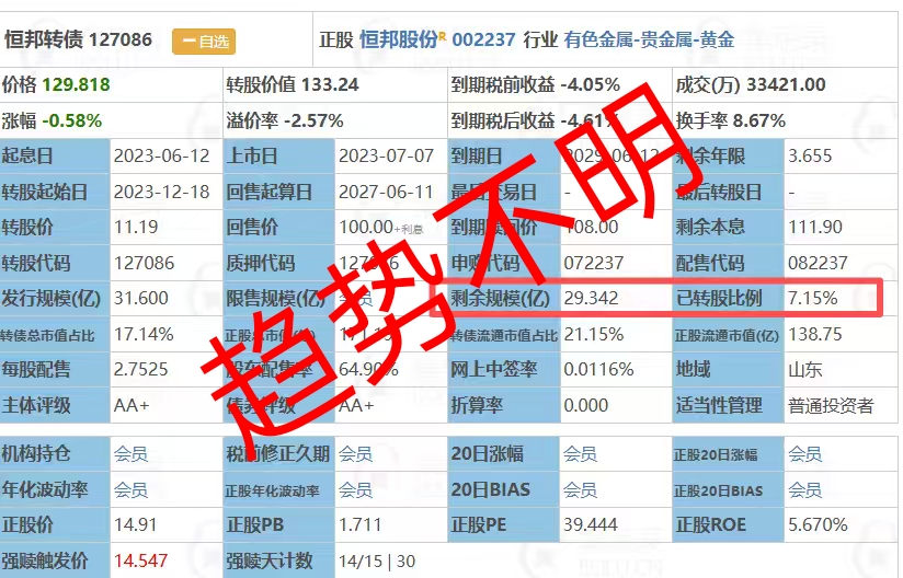 $恒邦股份(SZ002237)$ 不出意外今晚满足强赎,30亿可转债转股压力山大,其他黄金股票大涨唯独这厮磨蹭,真担心黄金创历史新高后回调,强赎公告后债转股抛压,股债齐跌