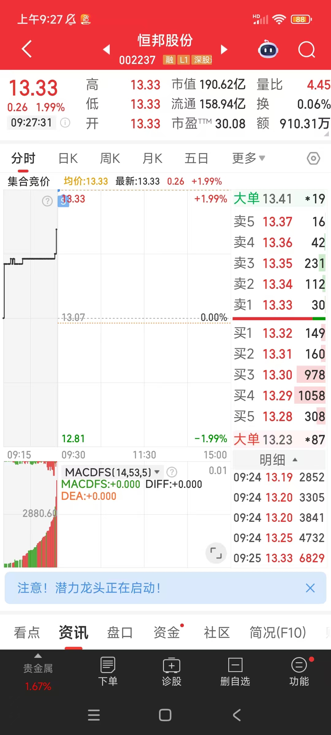 $恒邦股份(SZ002237)$ 昨天尾盘买的,本来想抄底湖南白银的挂低了,尾盘买白银就好了