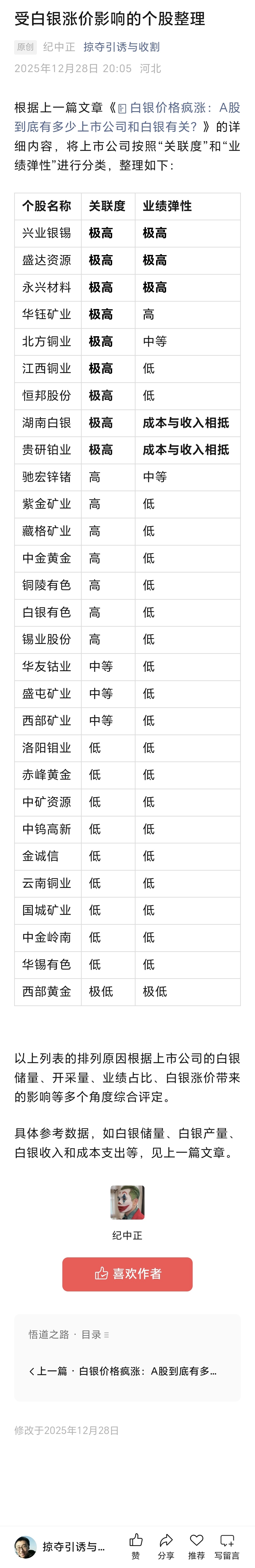$恒邦股份(SZ002237)$ $湖南白银(SZ002716)$ $贵研铂业(SH600459)$ 受白银涨价影响的个股整理.