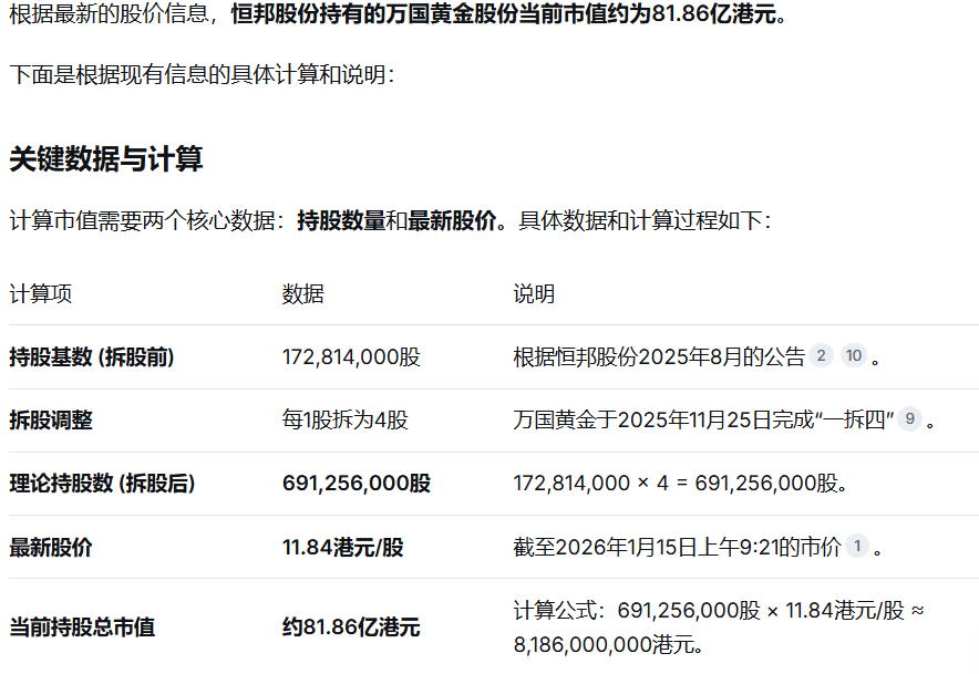 恒邦拥有万国黄金市值81.86亿元,当时买入成本3.7亿元,这笔投资净利润78亿