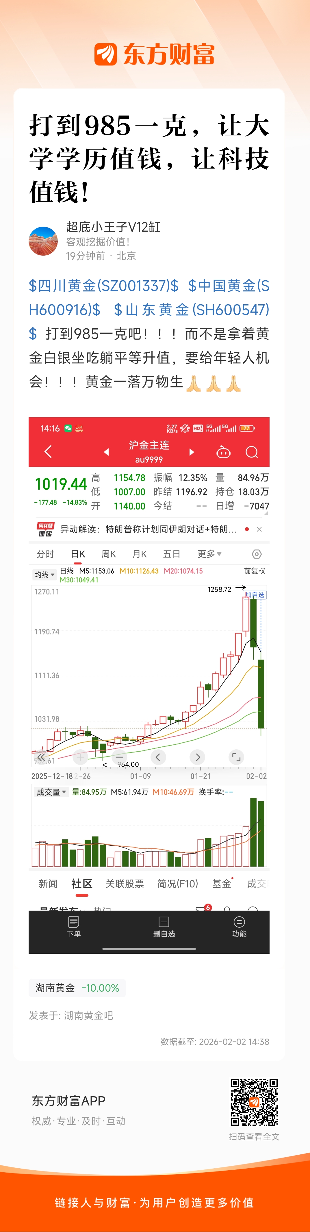 $四川黄金(SZ001337)$ $中国黄金(SH600916)$ $山东黄金(SH600547)$ 打到985一克吧!!!而不是拿着黄金白银坐吃躺平等升值,要给年轻人机会!!!黄金一落万物生
