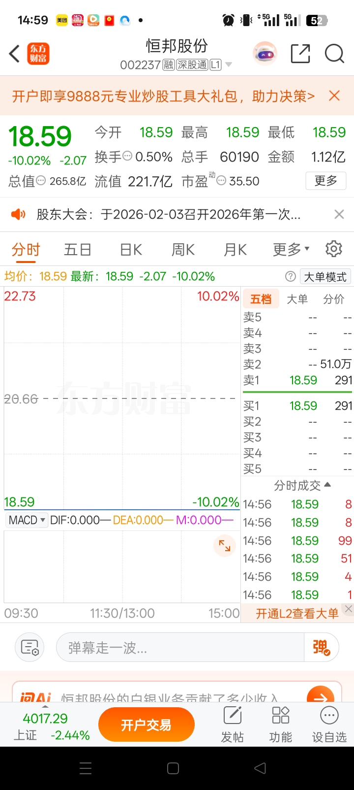 $恒邦股份(SZ002237)$ 51万手,没人抢筹,明天还是一个地板。我昨天喊破嗓子,让大家提前挂跌停可以出来,就是不听。