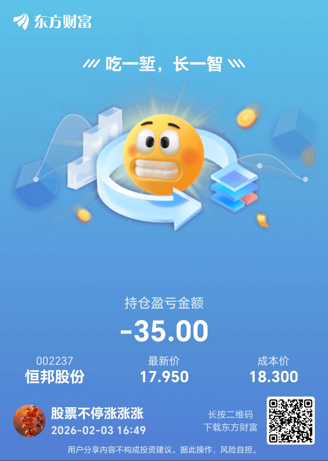 温馨提示: 1.根据《证券法》规定,禁止编造、传播虚假信息或者误导性信息,扰乱证券市场;2.用户在本社区发表的所有资料、言论等仅代表个人观点,与本网站立场无关,不对您构成任何投资建议。用户应基于自己的独立判断,自行决定证券投资并承担相应风险。《东方财富社区管理规定》