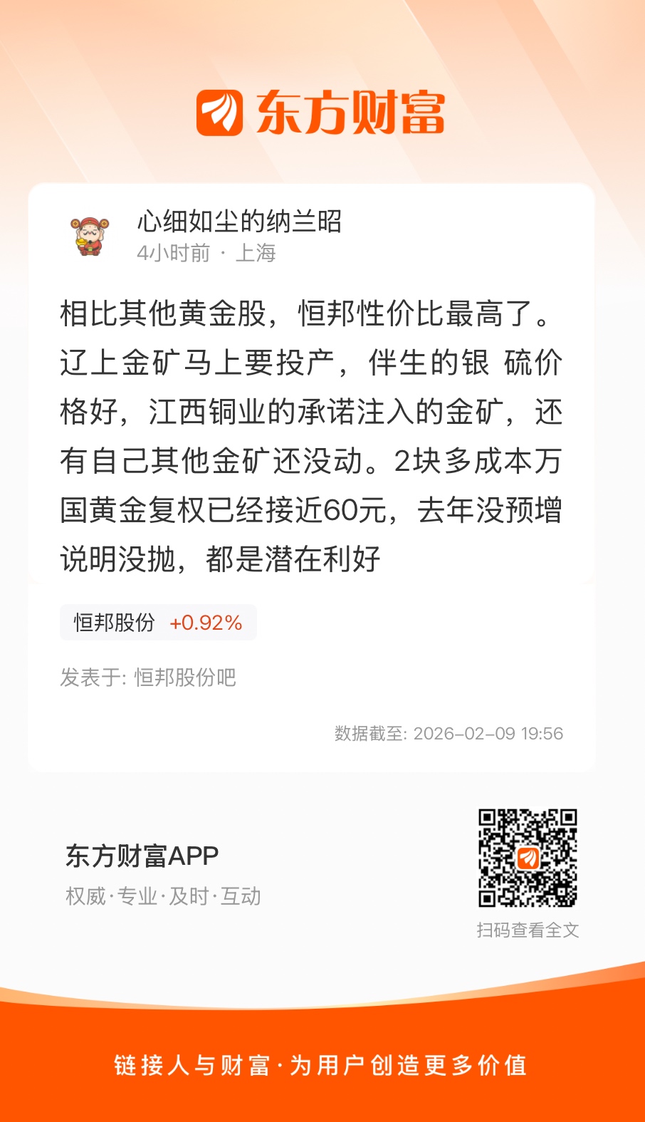 相比其他黄金股,恒邦性价比最高了。辽上金矿马上要投产,伴生的银 硫价格好,江西铜业的承诺注入的金矿,还有自己其他金矿还没动。2块多成本万国黄金复权已经接近60元,去年没预增说明没抛,都是潜在利好