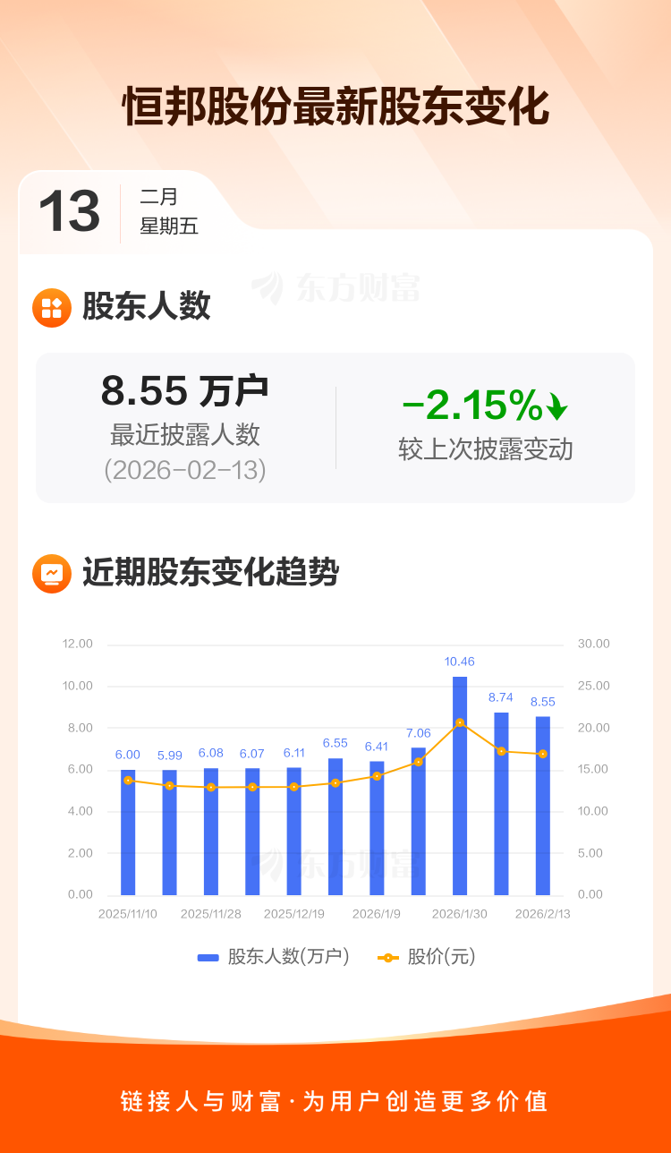 恒邦股份最新披露数据显示,截至2月13日公司股东户数为8.55万户,较上期(2026年2月10日)减少1878户,降幅为2.15%。户均持有流通股数量由上期的1.36万股上升至1.39万股,户均持股金额由上期的23.48万元增加至23.56万元。