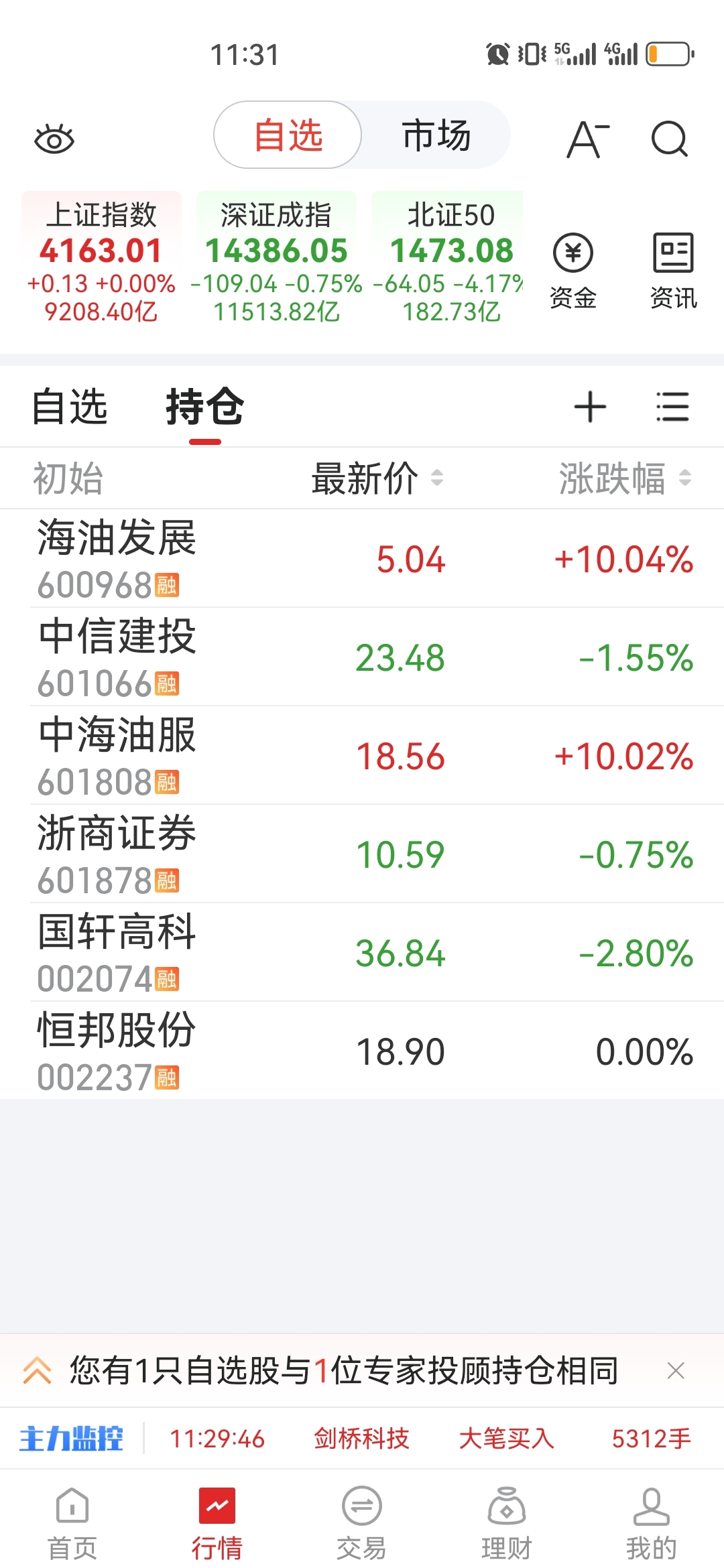 恒邦仓位1成,今天清仓中海油服,总仓位不到6成了