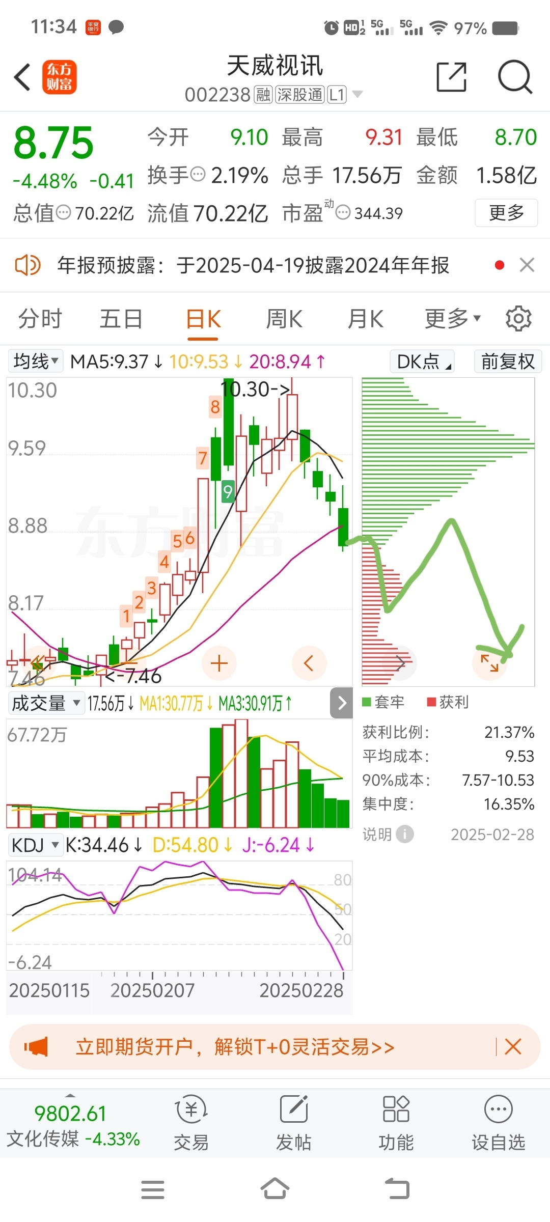 $天威视讯(SZ002238)$ 我的预测。先放这儿。欢迎打脸!!下周先小红,小绿十字星两天,然后继续暴跌,下下周反弹后,进入万劫不复的阴跌状态。
