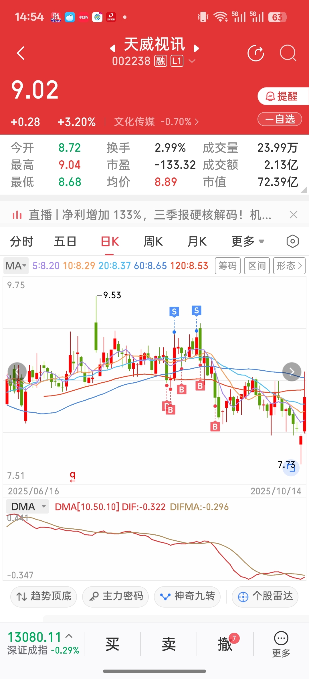 $天威视讯(SZ002238)$ 8元不敢补,失败