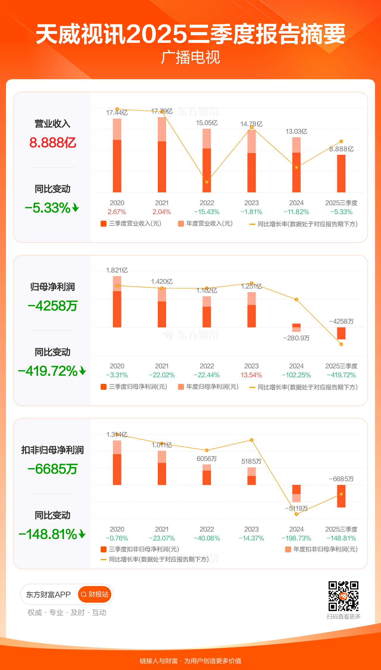 天威视讯10月31日发布2025年三季报显示,公司前三季实现营业收入8.89亿元,同比下滑5.33%;归母净利润-4258.43万元;扣非归母净利润-6685.06万元。