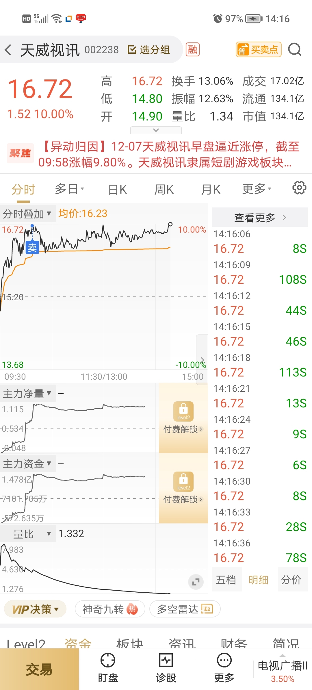 $天威视讯(SZ002238)$ 山上的兄弟们不要怕,我是大主力!