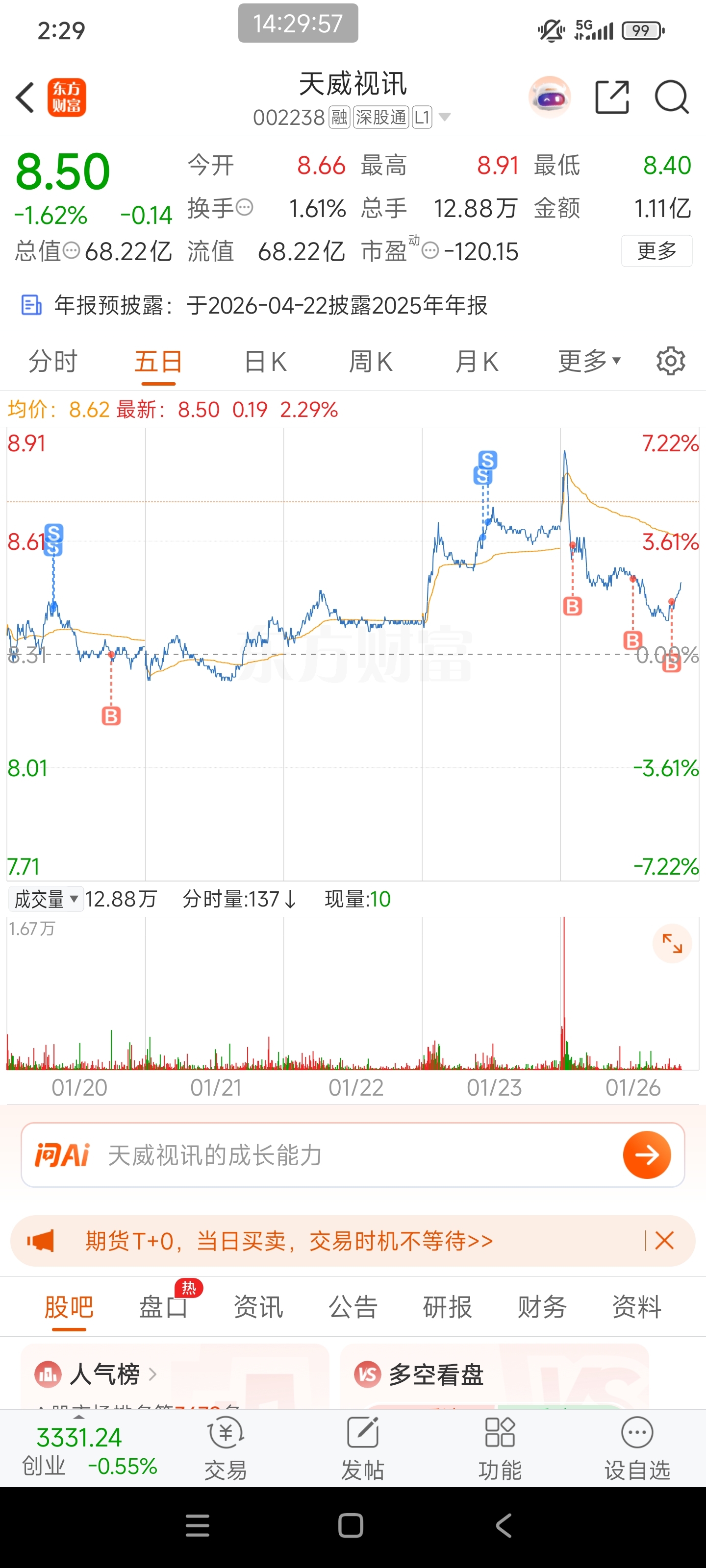 $天威视讯(SZ002238)$ 明天给个T的点位
