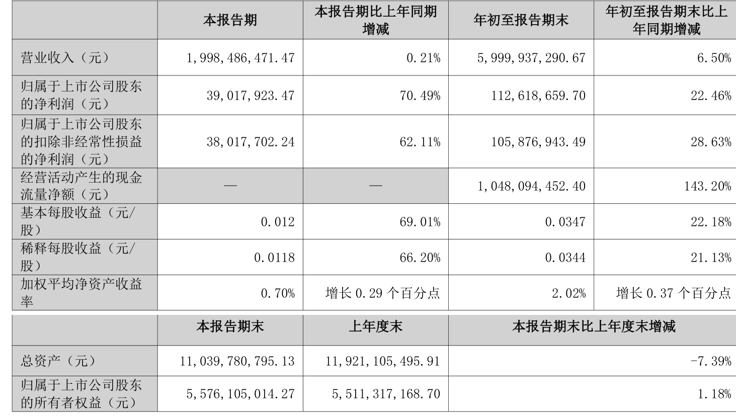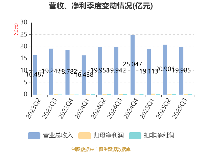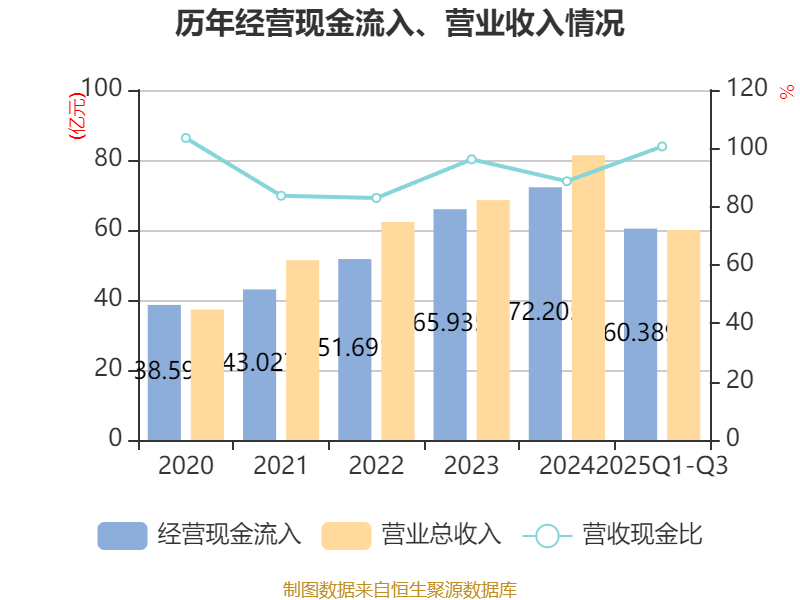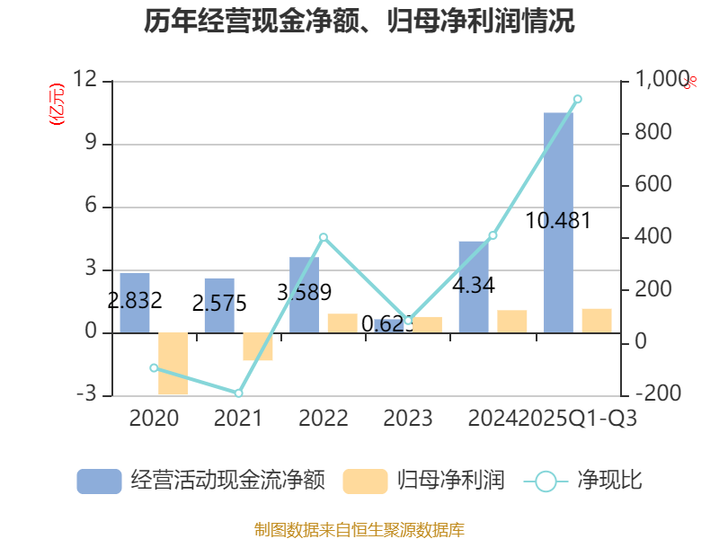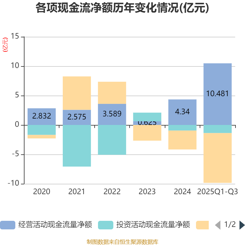 2025年前三季度,公司经营活动现金流净额为10.48亿元,同比增长143.2%;筹资活动现金流净额-8.47亿元,同比减少5.43亿元;投资活动现金流净额-1.38亿元,上年同期为-4602.07万元。