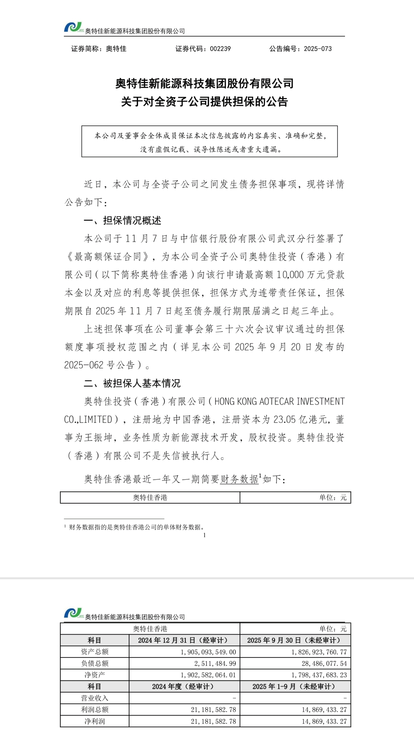 奥特佳为香港子公司做担保的动机