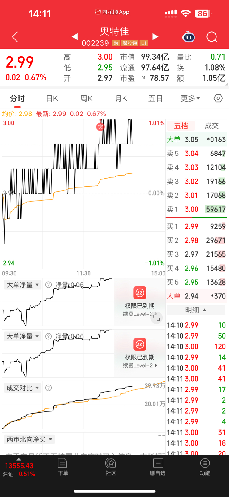 $奥特佳(SZ002239)$ 真牛逼,压完2.98 压2.99.现在又巨单压3元,一分一分走的艰难。