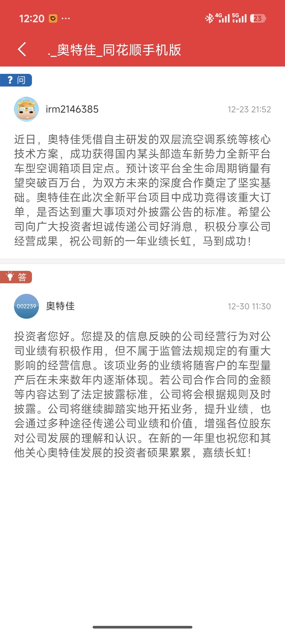 $奥特佳(SZ002239)$ 真能扯淡,你一个卖空调的,一辆车就几百上千块,谁给你签合同一次采购几百万套啊,不都是先定点,然后根据车销量随时下单吗,照这个说法你任何订单都不需要披露了