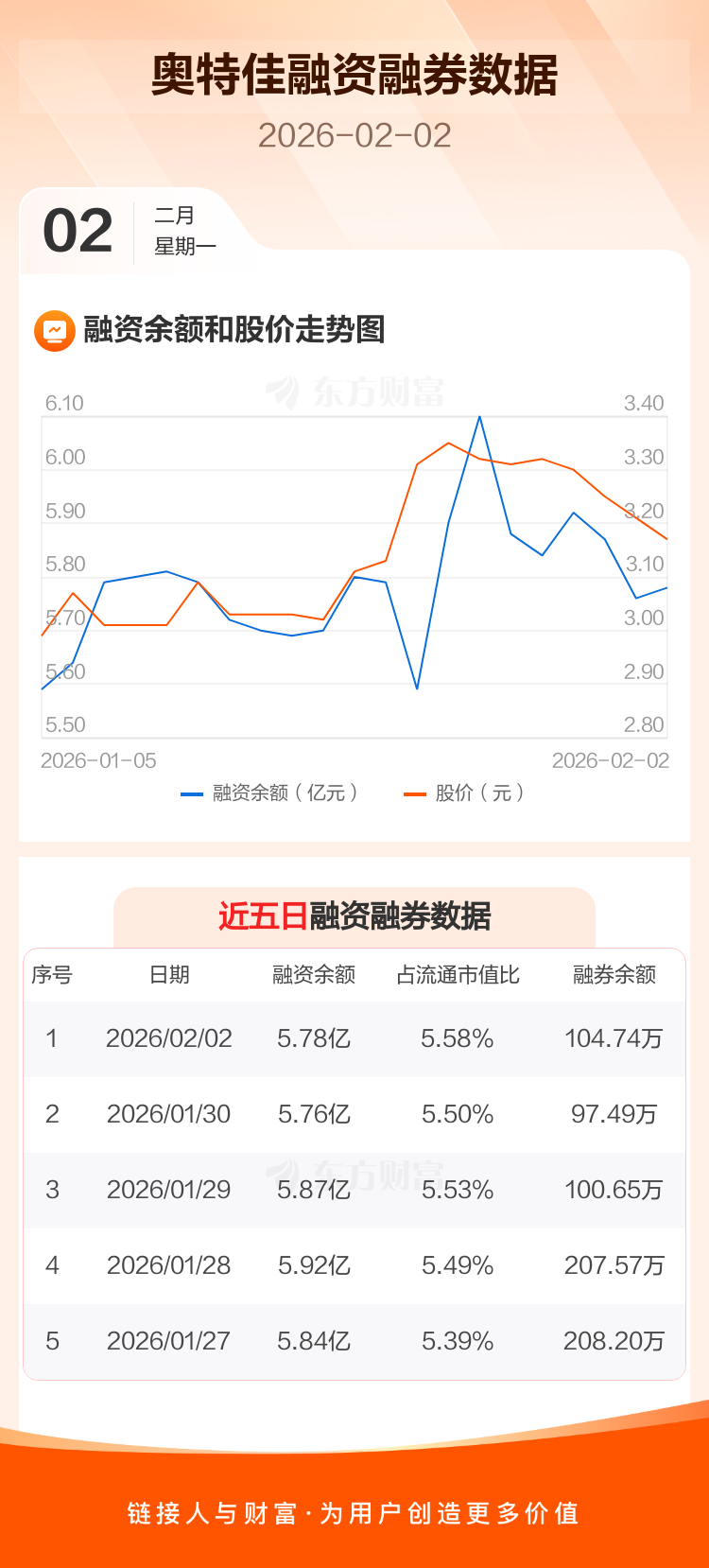 交易所最新数据显示,奥特佳于2026年2月2日获融资买入2791.37万元,融资偿还2643.96万元,当日融资净买入147.41万元。目前,该股融资余额5.78亿,占流通市值比例为5.58%。