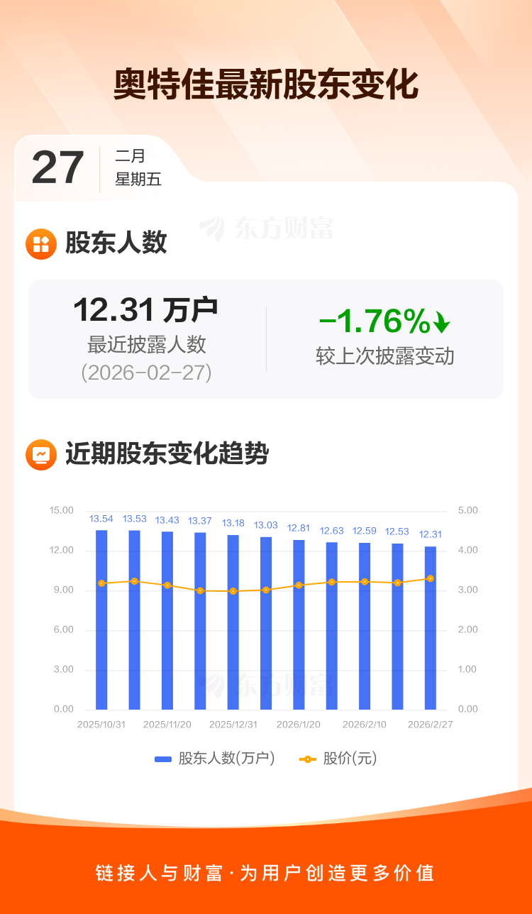 奥特佳:截至2月27日最新股东户数12.31万户,较上期减少1.76%